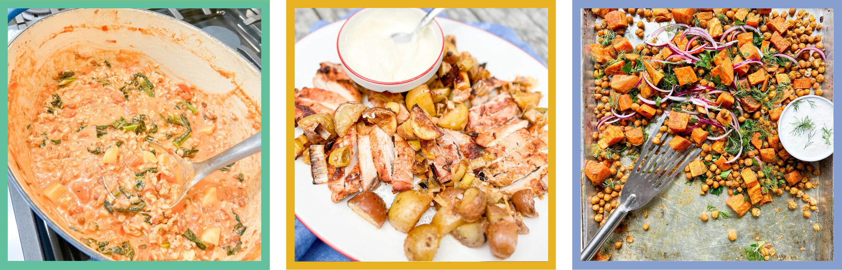 Use peeled and cubed celeriac in (above, from left to proper) winter stew; sheet-pan spiced rooster; and sheet-pan candy potatoes and chickpeas.