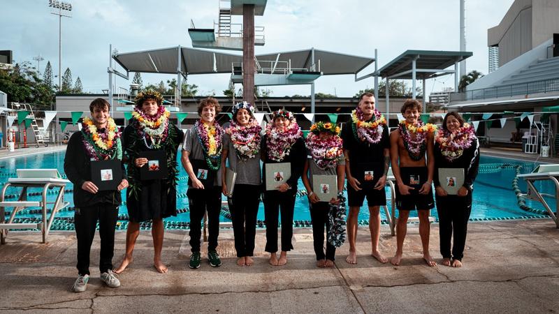 Following the twin meet, the Hawai’i seniors–Tim Brown, Tom Caps, Max Gilsenan, Zachary Kohm, Karol Ostrowski, Kailee Chow, Lola Davison, Kathryn Ivanov, Isabelle Meraz and Holly Nelson–were all honored.