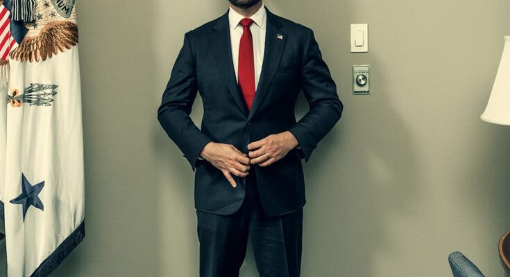 In Vance’s image, he has two gentle switches positioned straight subsequent to his left shoulder, and is way away from the digicam, making him seem quick and too small for the area. In phrases of Leavitt’s full-length image, one of many lampshades behind her shoulder is askew, a random pile of wooden is subsequent to her on the bottom, and the American flag subsequent to her is crumpled.