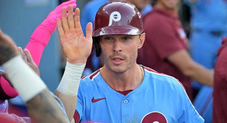 Philadelphia Phillies left fielder Max Kepler celebrates with teammates after scoring within the seventh inning in opposition to the Los Angeles Dodgers throughout Game 4 of the NLDS of the 2025 MLB playoffs at Dodger Stadium in Los Angeles Oct. 9, 2025. (Jayne Kamin-Oncea/Imagn Images)