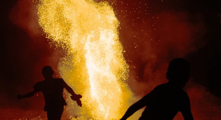 At first, there’s hearth. Not as an explosion, not as spectacle, however as a presence that lingers. A column of incandescent particles rises from the bottom, illuminating the evening like a wound that refuses to shut. Two figures run, their our bodies caught between concern and familiarity. Elsewhere, kids stand nonetheless, watching the earth burn as if it have been a part of the panorama, one thing recognized, inherited, virtually bizarre. In “The Mark of a Terrible Sun,” Ioanna Sakellaraki doesn’t {photograph} disaster as an occasion. She images what stays as soon as disaster has already handed via lives, our bodies, and reminiscence.