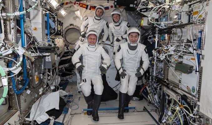 Four SpaceX Crew-11 members collect collectively for a crew portrait sporting their Dragon strain fits throughout a swimsuit verification verify contained in the International Space Station’s Kibo laboratory module on Jan. 9, 2026. Clockwise from backside left are, NASA astronaut Mike Fincke, Roscosmos cosmonaut Oleg Platonov, NASA astronaut Zena Cardman, and JAXA (Japan Aerospace Exploration Agency) astronaut Kimiya Yui. Image: NASA