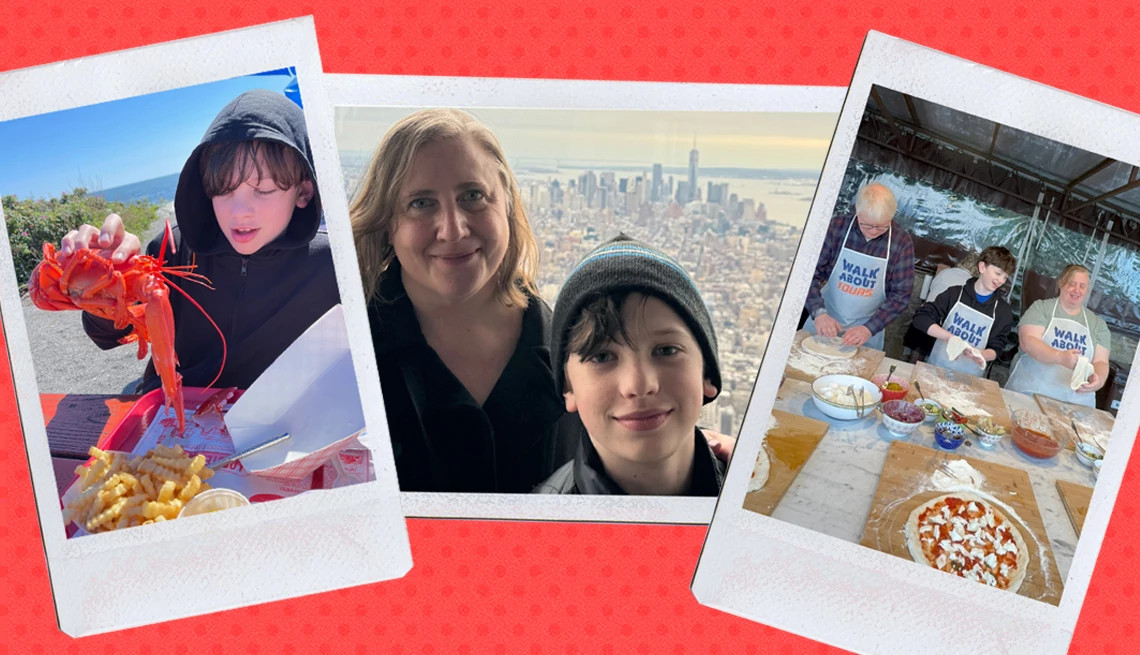 From left to proper: Amy’s son tries lobster in Maine; Amy and her son view Manhattan from the Empire State Building; the household be taught to make pizzas at a Tuscan farmhouse exterior of Florence, Italy.