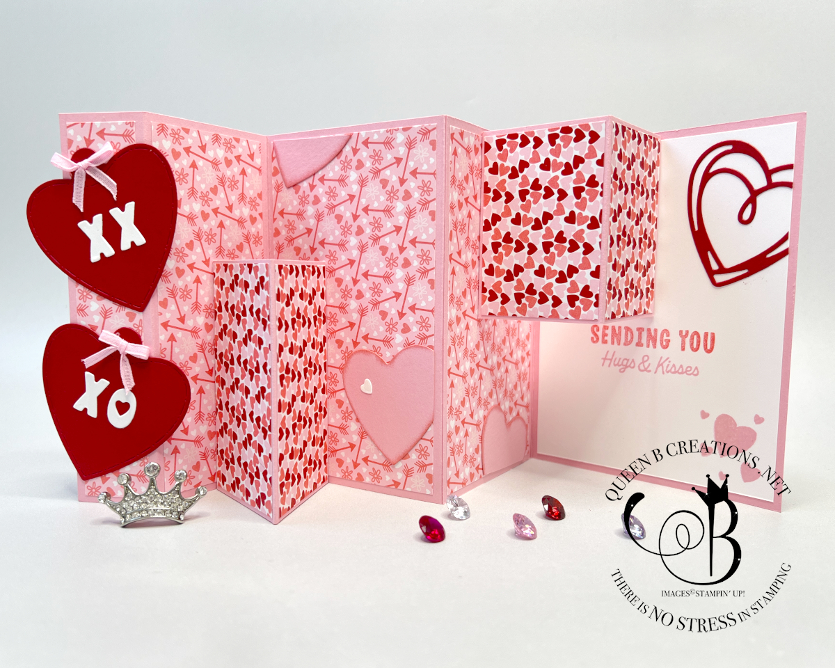 For full measurements and step-by-step directions on the right way to create this Valentine’s Day enjoyable fold card, you’ll want to watch the video beneath. I record and hyperlink the entire Stampin’ Up! provides I used so you’ll be able to simply store and recreate this challenge. When you store via my hyperlinks, you’re supporting my small enterprise, Queen B Creations, and serving to me proceed to share artistic card making inspiration with you.