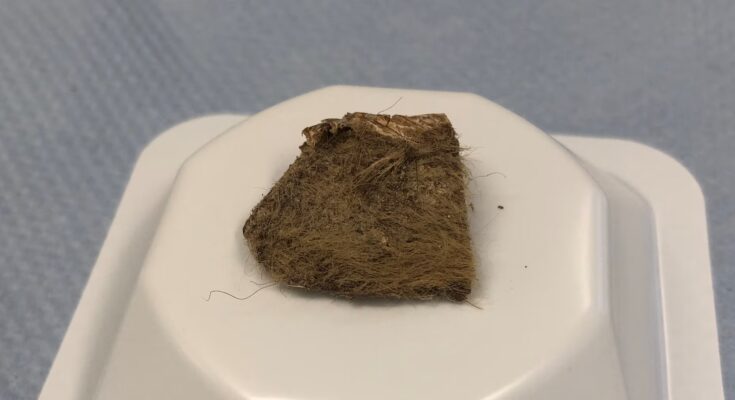 Item 1 of three A chunk of tissue from a woolly rhinoceros that was discovered contained in the abdomen of an Ice Age gray wolf pet found in permafrost close to the Russian village of Tumat in northeastern Siberia is seen in a laboratory in Vienna, Austria, on this handout image taken in 2020. Love Dalen /Handout through REUTERS