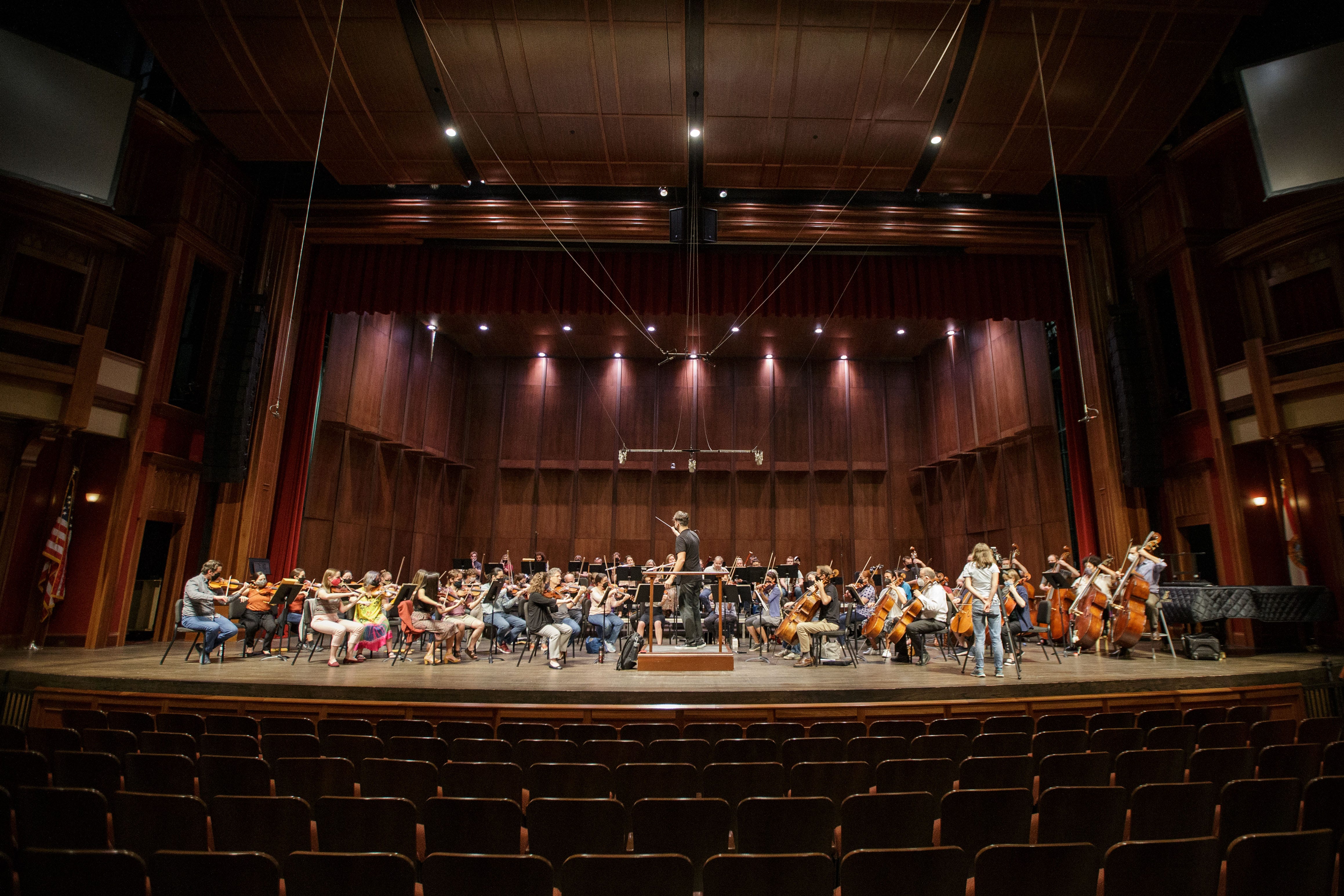 The Tallahassee Symphony Orchestra rehearses inside Ruby Diamond Auditorium as they prep for his or her first live performance because the begin of the pandemic.