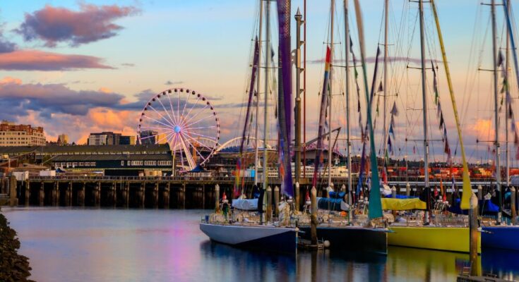 Seattle downtown waterfront buildings and sail boats docked on Puget Sound at sunset Seattle, Washington, United StatesSeattle downtown waterfront buildings and sail boats docked on Puget Sound at sunset Seattle, Washington, United States