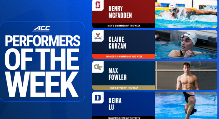 CHARLOTTE, N.C. (theACC.com) – In the twelfth set of weekly honors for the 2025-26 Atlantic Coast Conference Swimming & Diving season, Stanford’s Henry McFadden named the ACC Men’s Swimmer of the Week, whereas Georgia Tech’s Max Fowler earned Men’s Diver of the Week honors. Virginia’s Claire Curzan was named the ACC Women’s Swimmer of the Week, whereas Duke’s Keira Lu was named the ACC Women’s Diver of the Week.