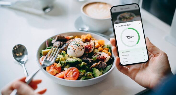 A close-up of a person using a fitness app on their phone to track their meal, a "Beef Cobb Bowl," which is shown on the table.