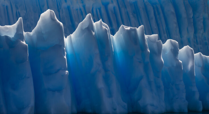Sculptured ice, Antarctica. Although sure spots are well-known for accumulating icebergs (iceberg “graveyards”), winds could cause icebergs to gather in sudden locations, like this space close to Palmer Station.