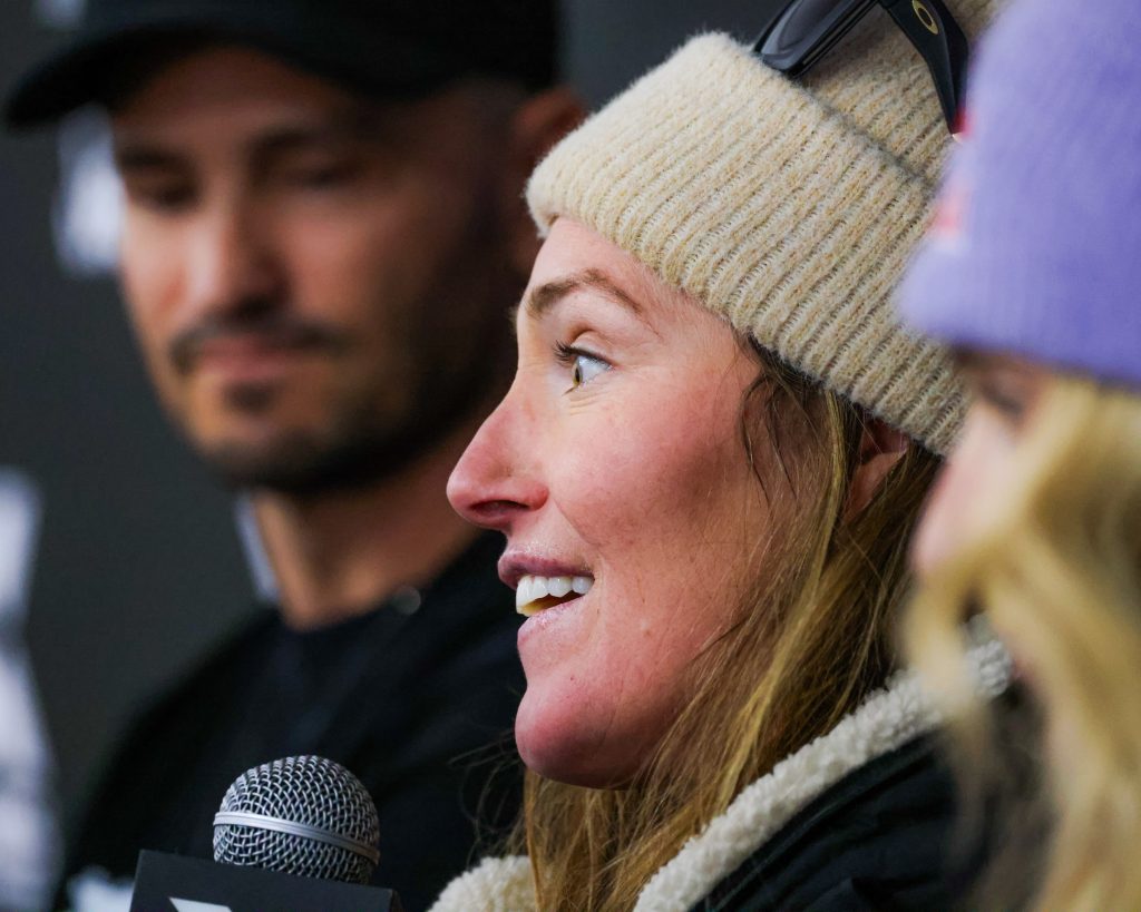 American snowboarder Jamie Anderson smiles whereas listening to Austrian snowboarder Anna Gasser discuss throughout the X Games Aspen pre-event press convention on Thursday, Jan. 22, 2026, at Buttermilk Ski Area.