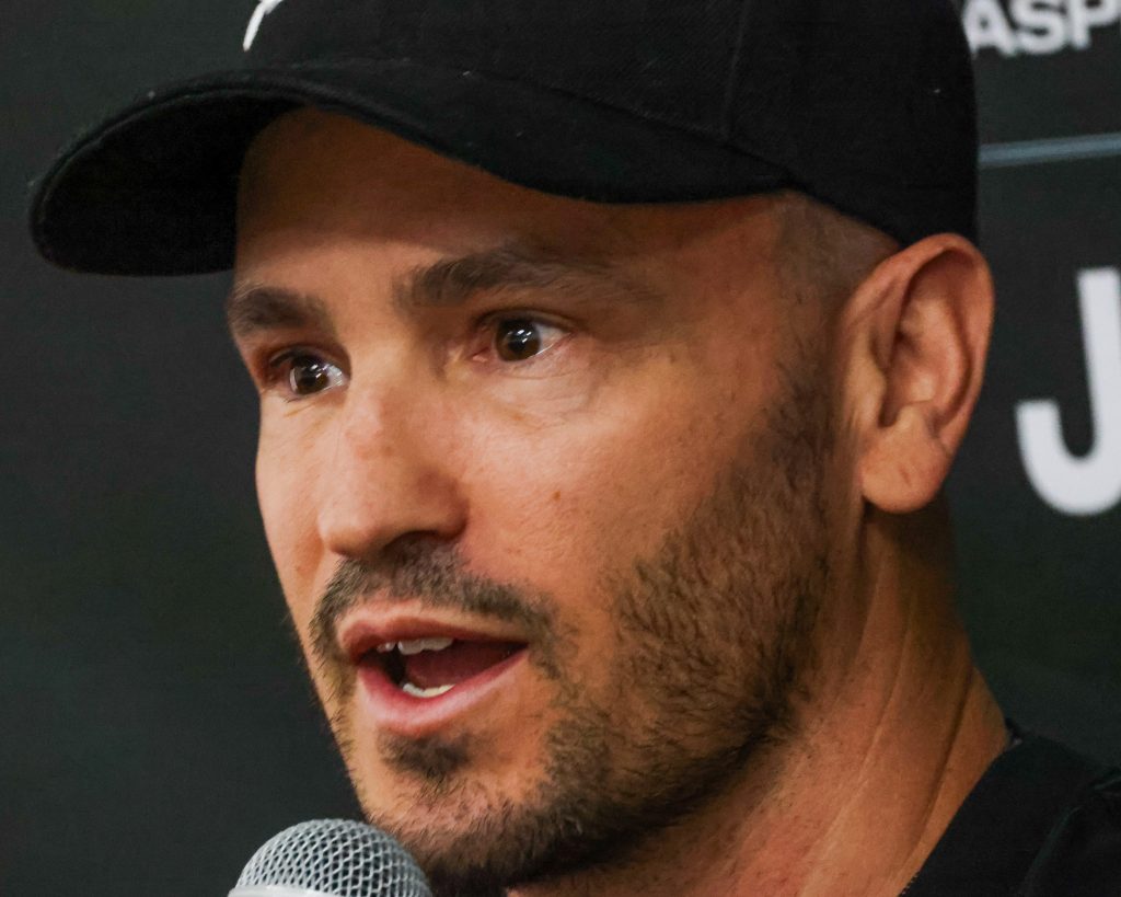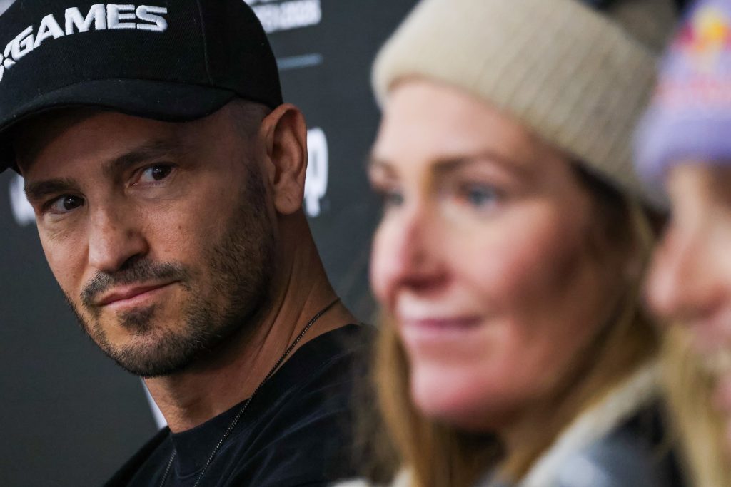 X Games CEO Jeremy Bloom, left, sitting with Australian snowboarder Scotty James, talks throughout the X Games Aspen pre-event press convention on Thursday, Jan. 22, 2026, at Buttermilk Ski Area.