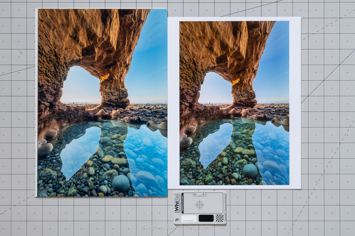 This is a photograph of a 16×24 metallic print with a number of reference pictures ganged up. The inexperienced of the seascape within the backside left can also be heat like within the prior image although that is from a unique lab. In the underside proper, not the entire 12 squares within the black to white take a look at strip are impartial and a few pattern towards magenta.