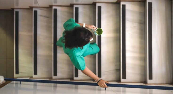 a woman in a nurse uniform holding a cup of coffee walks up stairs