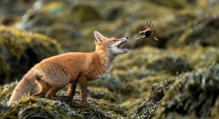 A red fox stands on seaweed-covered ground, mouth open and eyes focused as it prepares to catch a crab that is mid-air in front of it.