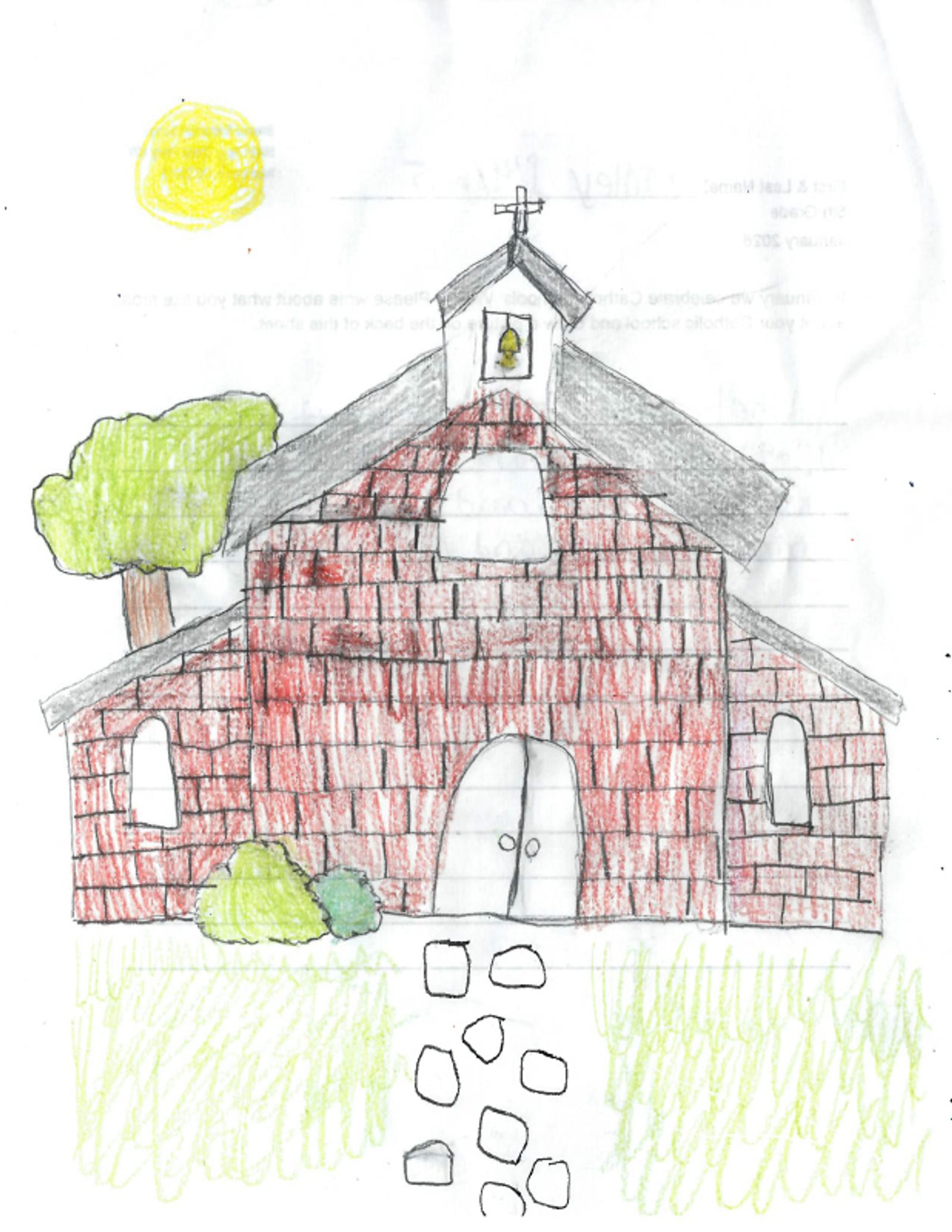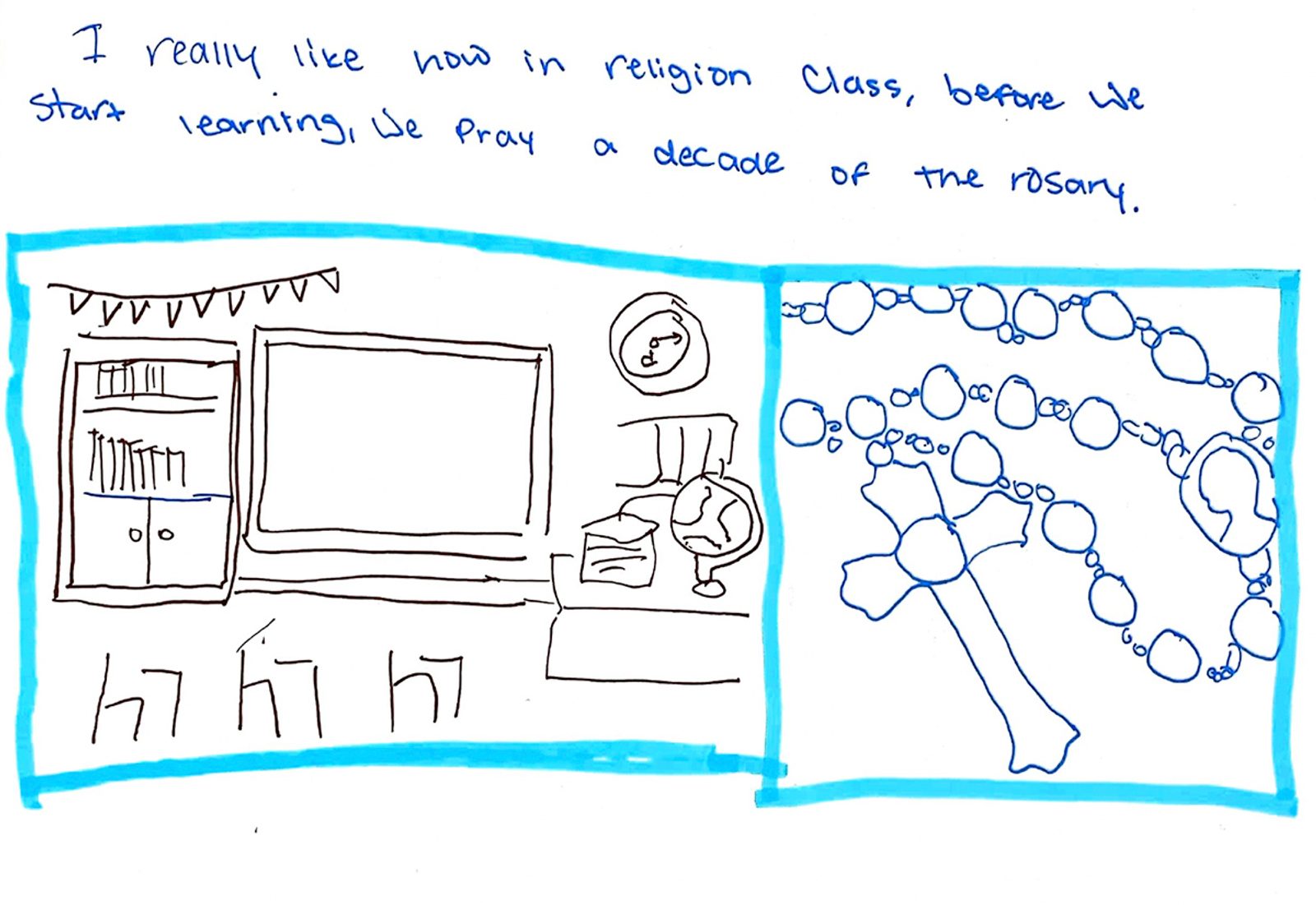 “I like a lot of things about my school, religion classes, and my church. Like for my church, I like the homilies, Father Scott makes them fun. For my religion classes, I like doing things like reading the Bible. Something I like about my school is all the things we do for the community; I feel that is important. I enjoy being in a Catholic school. I get lots of opportunities to grow in my faith and learn about God. I love being in a Catholic school.” – Artwork and writing by Norah Beauchamp, sixth grade, Little Flower School, Great Mills