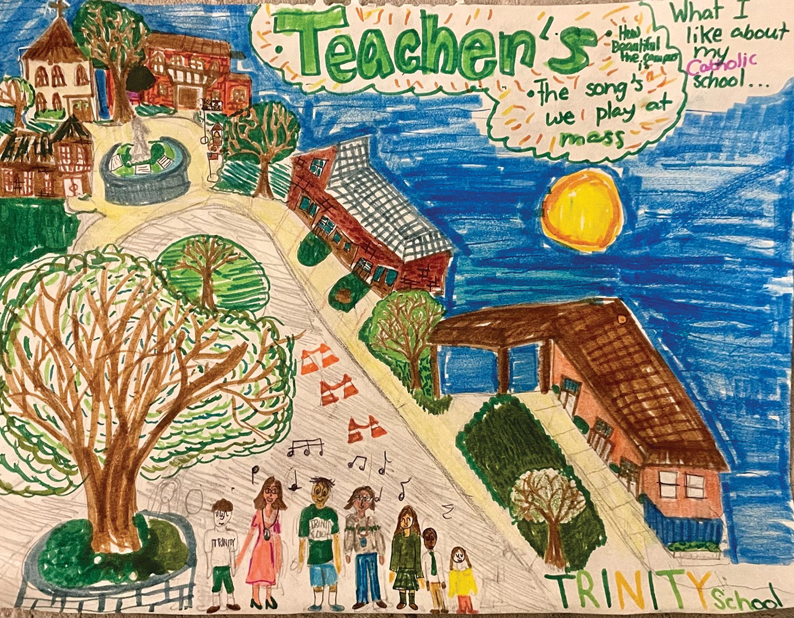 “To me, Catholic school means where we spend time together in Mass and sing joyful songs like, ‘How Good is the Good God,’ one of my favorite songs. We have great teachers teaching us math, science, language arts, and St. Julie’s values…” – Artwork and writing by Anna Kubik, fourth grade, Trinity School, Ellicott City, Maryland