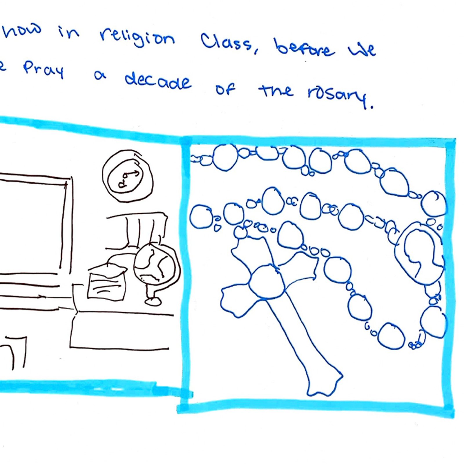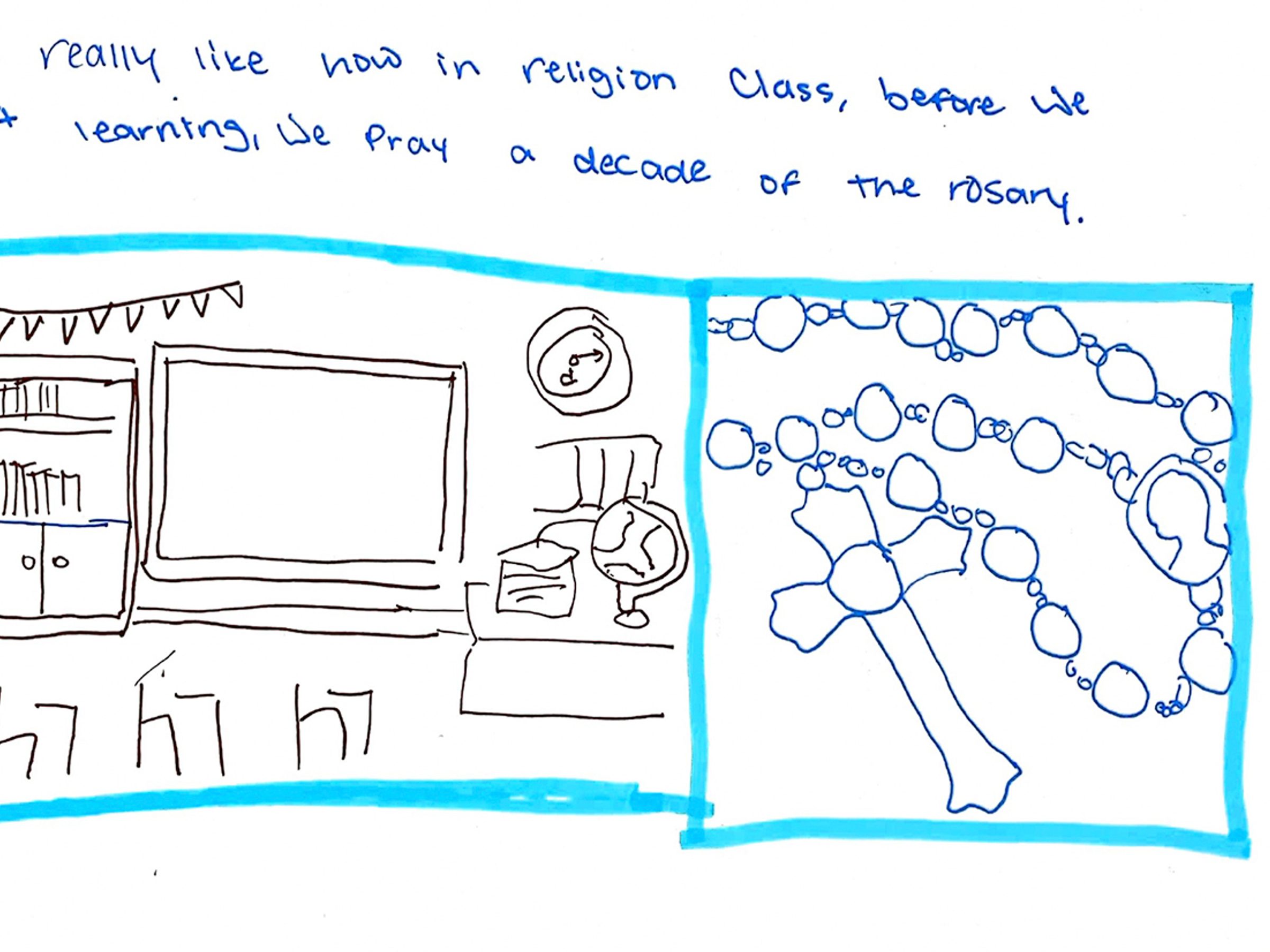 “One thing I really like about my Catholic school is how we start the day. Every morning we start the day by saying a prayer. It’s everyone in the school, from preschool 3’s to eighth grade, all the way to the teachers, that makes starting the day by talking to God special. When I walk into my classes, one of the first things I see is a cross. Every room has one. This reminds me every day how united this school is and how lucky I am to be part of this community.”