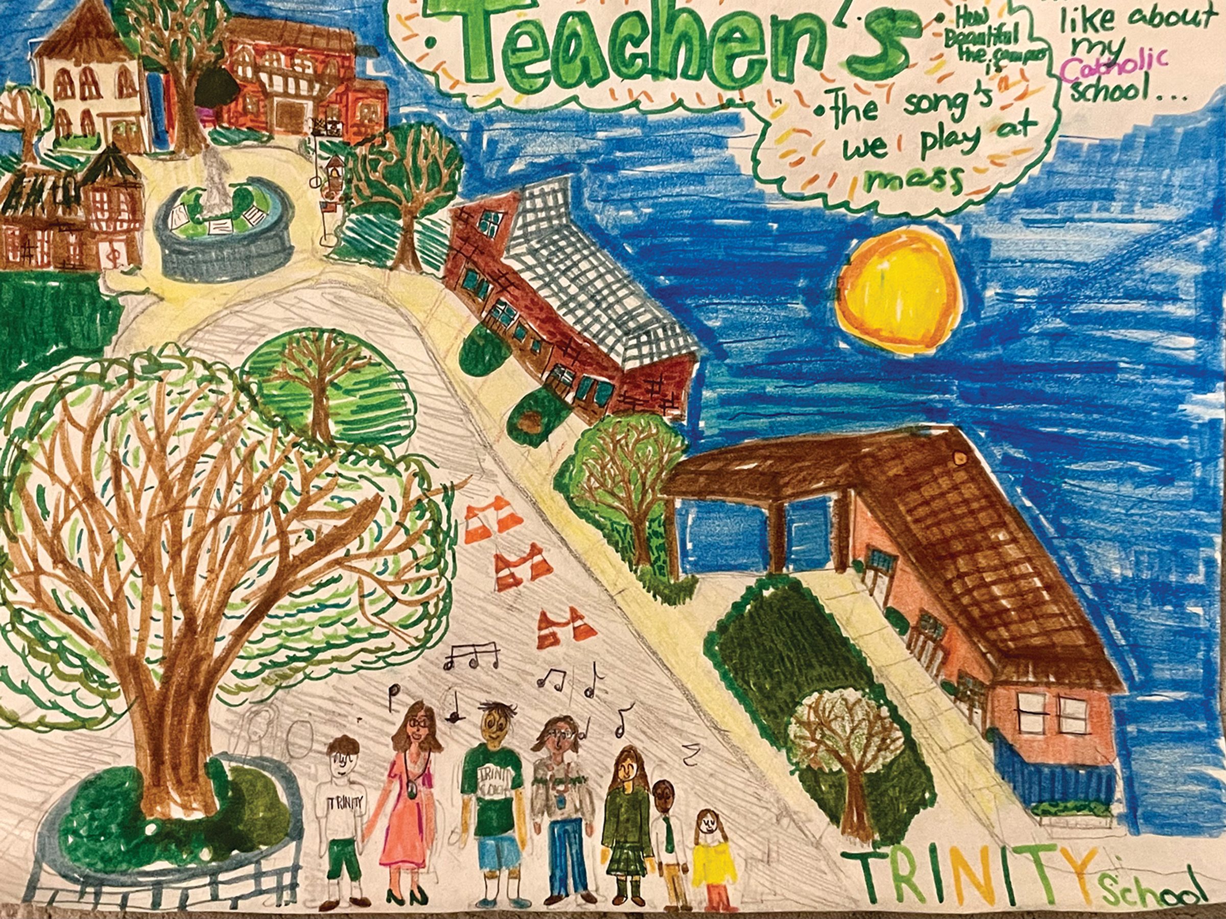 “To me, Catholic school means where we spend time together in Mass and sing joyful songs like, ‘How Good is the Good God,’ one of my favorite songs. We have great teachers teaching us math, science, language arts, and St. Julie’s values…” – Artwork and writing by Anna Kubik, fourth grade, Trinity School, Ellicott City, Maryland