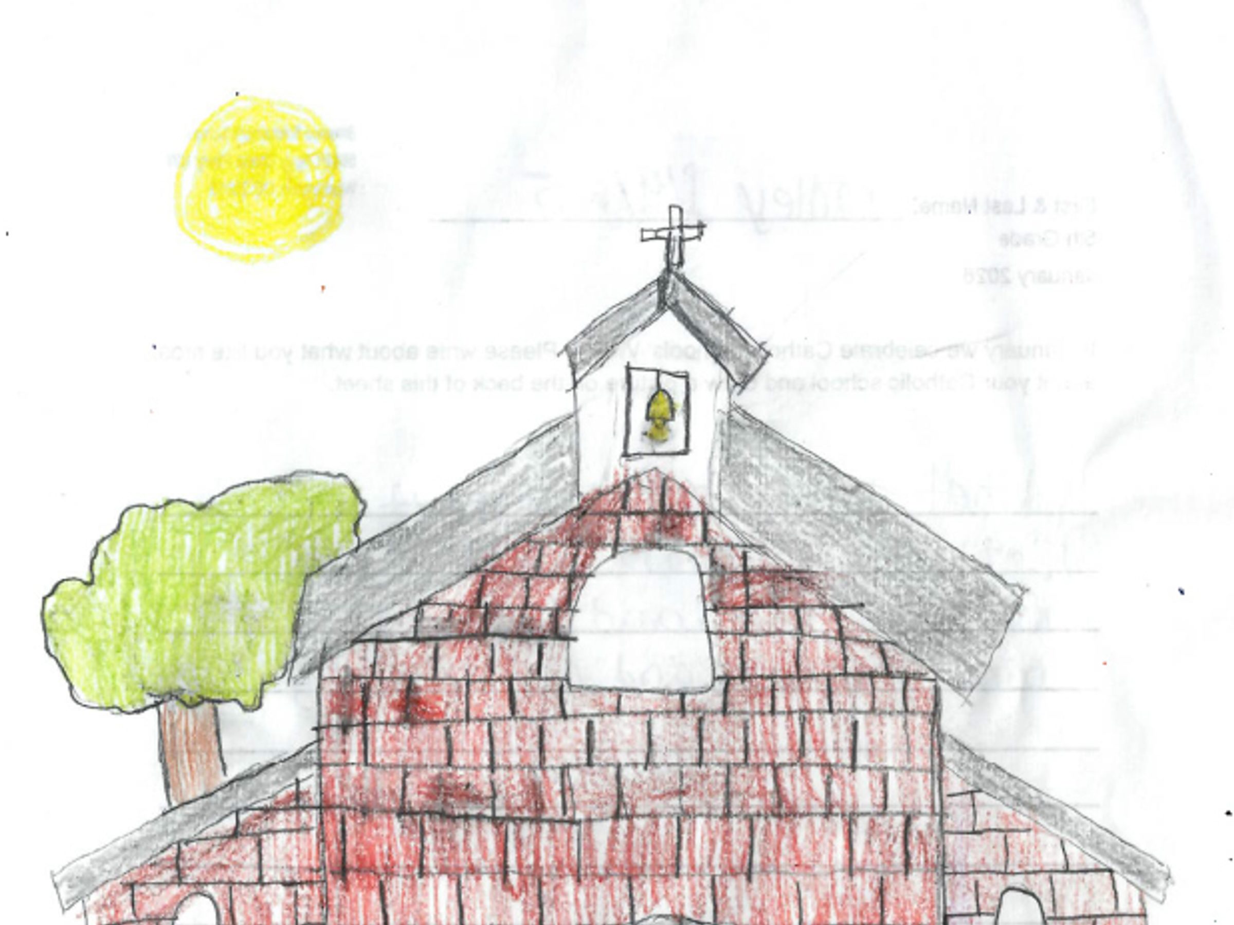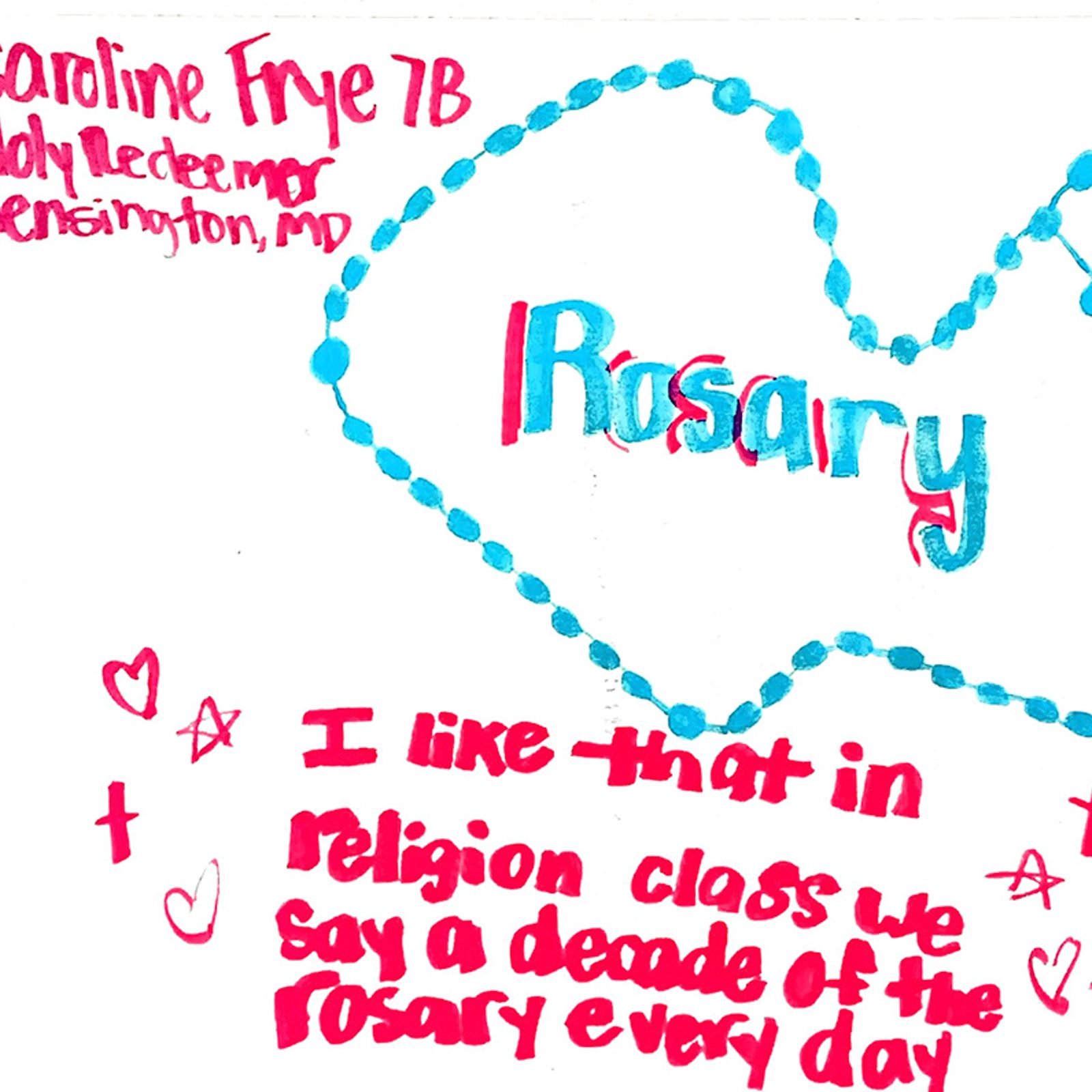 “I like a lot of things about my school, religion classes, and my church. Like for my church, I like the homilies, Father Scott makes them fun. For my religion classes, I like doing things like reading the Bible. Something I like about my school is all the things we do for the community; I feel that is important. I enjoy being in a Catholic school. I get lots of opportunities to grow in my faith and learn about God. I love being in a Catholic school.” – Artwork and writing by Norah Beauchamp, sixth grade, Little Flower School, Great Mills
