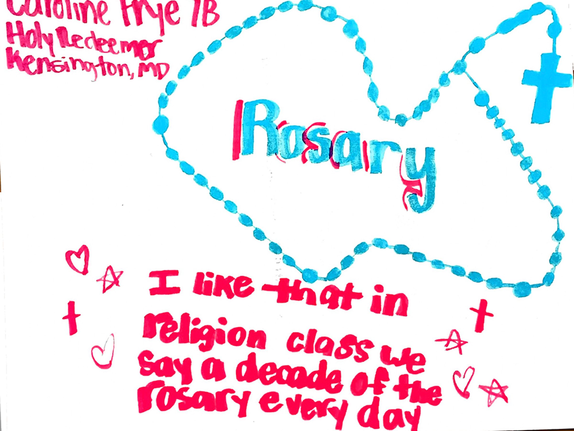 “I like my Catholic school because I learn about Jesus every day. We pray together and learn how to be kind and help others. My teachers help me grow in faith and teach me how to love God even more.” – Artwork and writing by Bella Stanton, seventh grade, St. Columba School, Oxon Hill