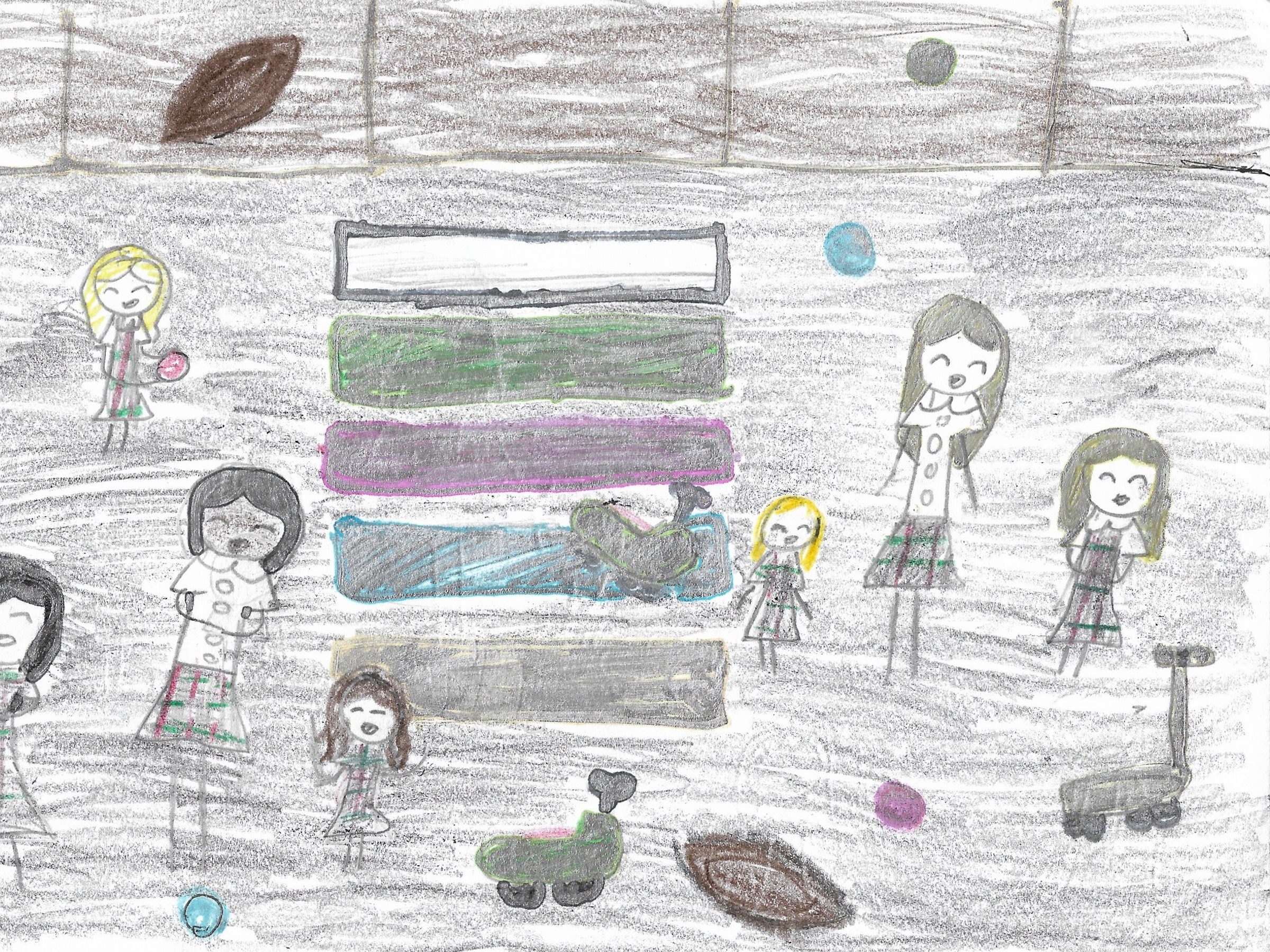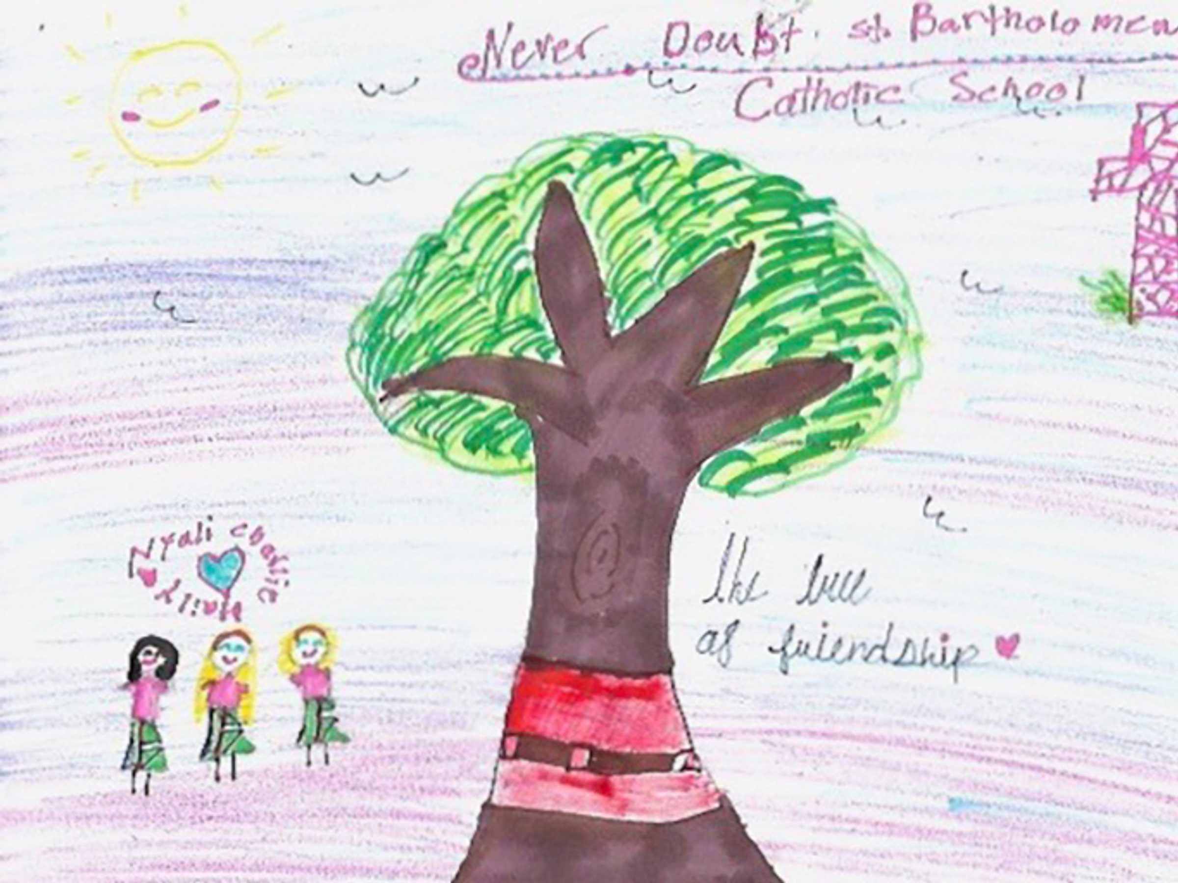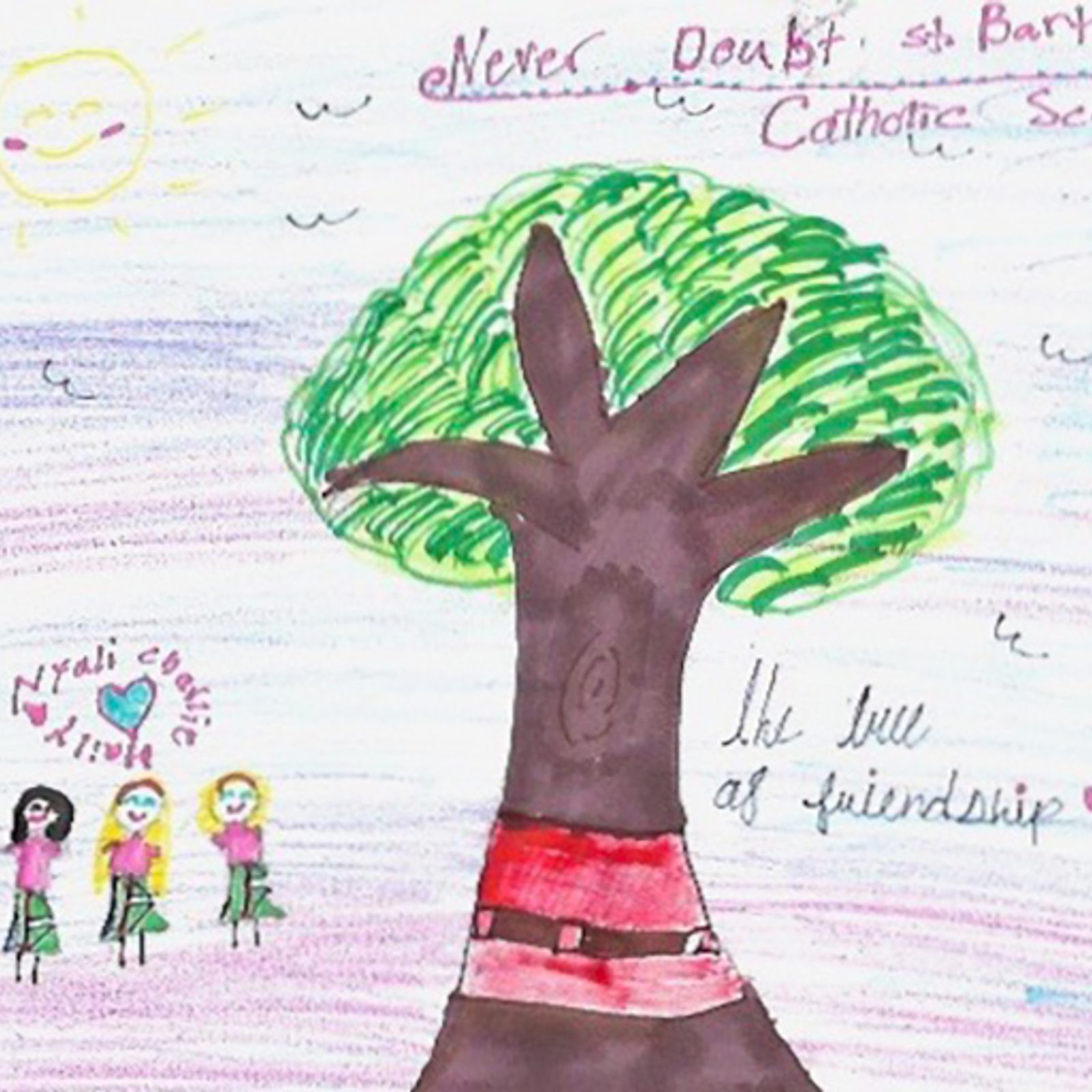“My name is Charlie, and I love my St. Bartholomew School. I have been at this school for a total of two years, and this community is something I like to call a small school with a big heart. I have met my best friend of my dreams, Nyali. Every day, we explore new things but the thing I love the most about my school is the tree of friendship. The tree of friendship is what separates the preschool from elementary and middle school. That tree indicates the bond between littles and bigs. I have so many memories of that tree, either collecting acorns with Nyali for fun or pushing a little kid on a scooter. It is also a nice school because as you get older, you still have a Mass buddy, that is like being a sister no matter who you are, where you came from or what you look like. That tree with that gleaming red bench can bring anyone together. And that is why that tree means so much to me as a fifth grader.” – Artwork and writing by Charlie Dean, fifth grade, St. Bartholomew Catholic School, Bethesda