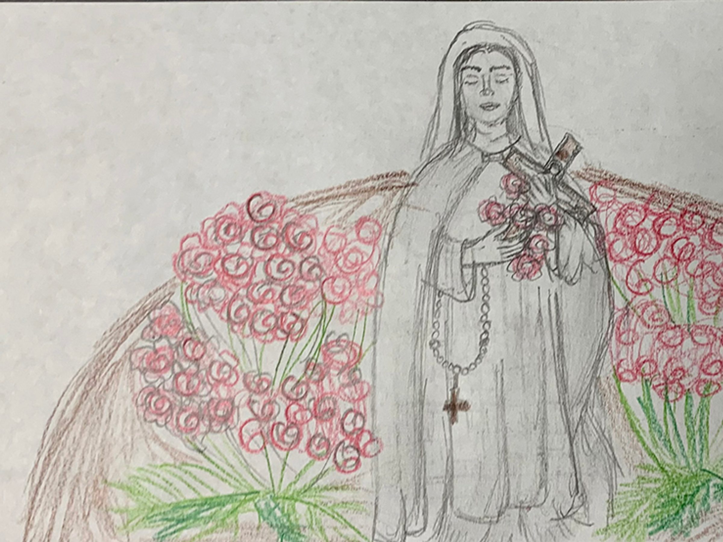 “Little Flower is a great school; it’s a great community. We go to church every Tuesday and pray together as one. Little Flower School has a great learning environment while still having fun. I love that everyone has unique gifts, and they get to use them every day. I also like that we pray in every class, and how our life is circled around kindness and faith. We also pray to St. Thérèse of Lisieux, who is our patron saint. At Little Flower, we talk about all the virtues. Everyone is friendly and nice. These are all the reasons why I love my school.” – Artwork and writing by Madelynn Beall, eighth grade, Little Flower School, Great Mills
