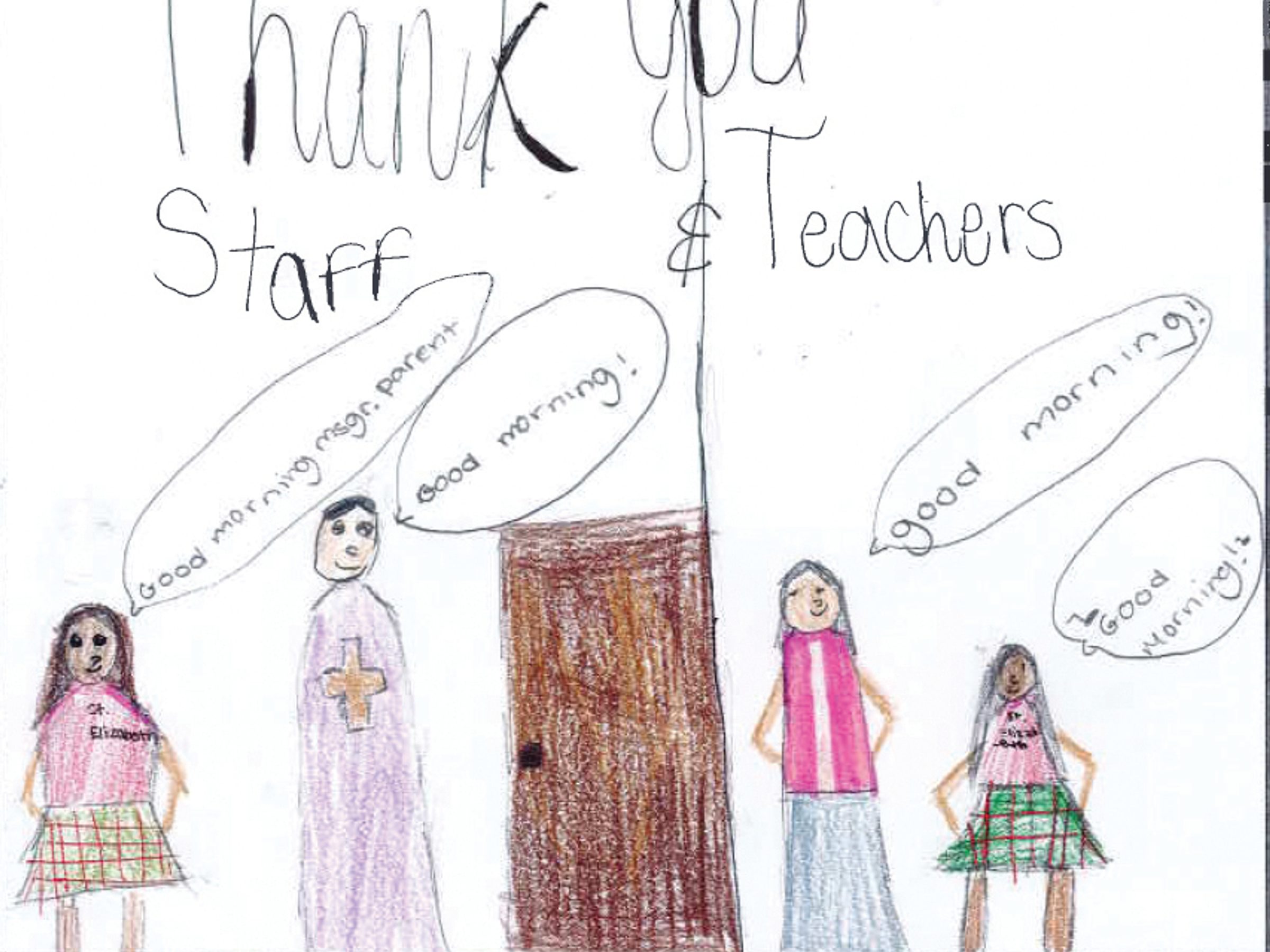 “My favorite thing about St. Elizabeth School is our uniform, because we have the word SAINTS written on it. This means we’re all called to be saints, and nothing can stop us from getting closer to God. When I look around the church during Mass, it’s a beautiful sight to see all the students from kindergarten to eighth grade wearing matching sweatshirts that prove our potential to become saints. I love that our school puts God above all else. We have a crucifix in every classroom, and we begin each class with a prayer. We also have Mass every other week, and it brings us closer to God and each other. Our school is a wonderful environment that spreads love, kindness and the faith. St. Elizabeth School, thank you for everything you do to help our students grow and develop into God-loving people!” – Artwork and writing by Julia Toumi, eighth grade, St. Elizabeth School, Rockville