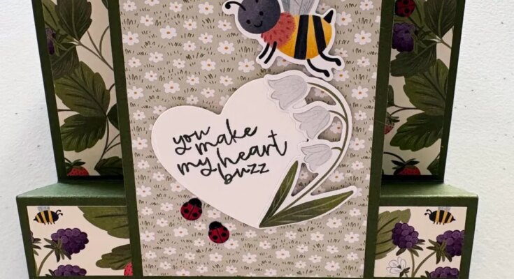 After reducing and folding, I glued Sweet As A Bug Designer Paper to the entrance of the cardboard base: 5 1/4″ X 2 3/4″ and 5 1/4″ X 1″.  Then, I glued a unique sample of Cute As A Bug Designer Paper to the entrance of the highest piece, 2/3/4″ X 4″. When gluing the highest piece to the cardboard base, I glued solely the portion that touches the cardboard base, whereas laying folded, and flat, to insure the sides had been even. I additionally added Basic White Cardstock to the within, 5 1/4″ X 2 3/4″, for a private message.