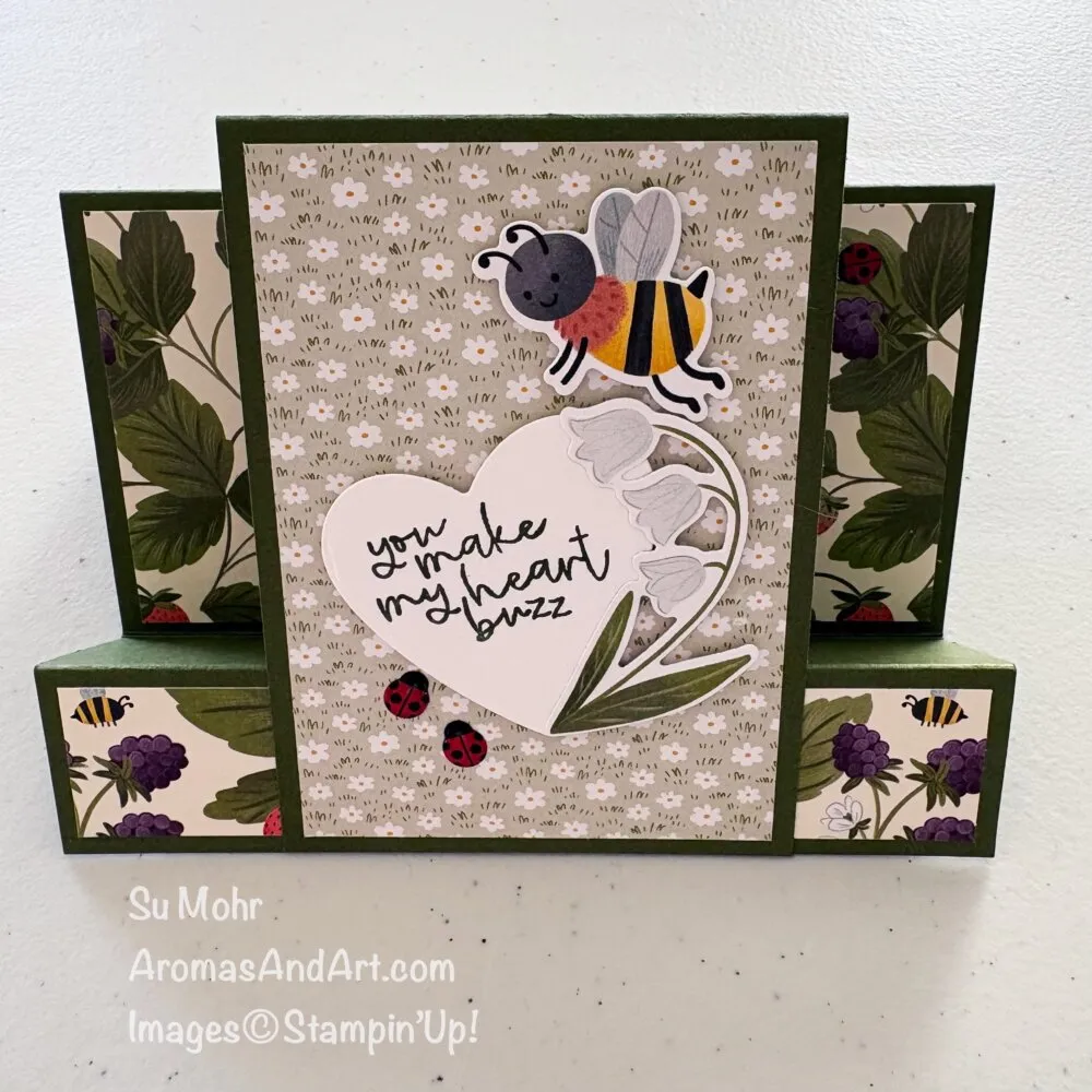 “You make my heart buzz” is from the Be Mine Stamp Set, stamped in Mossy Meadow Ink on Basic White Cardstock. Then, I used an Endless Love Die for reducing the center. The flowers and bee had been lower from Cute As A Bug DSP with Sweet Bugs Dies, and all had been hooked up with Dimensionals. I like the way in which the flowers match the form of the center. For further pizazz, I added three Ladybug Epoxy Shapes. Can you discover the third one, hidden on a leaf?
