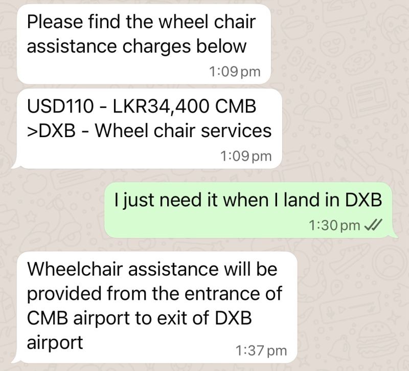 Every time I fly in or out of Sri Lanka, I discover that a few of the airways I take advantage of cost individually for wheelchair help.