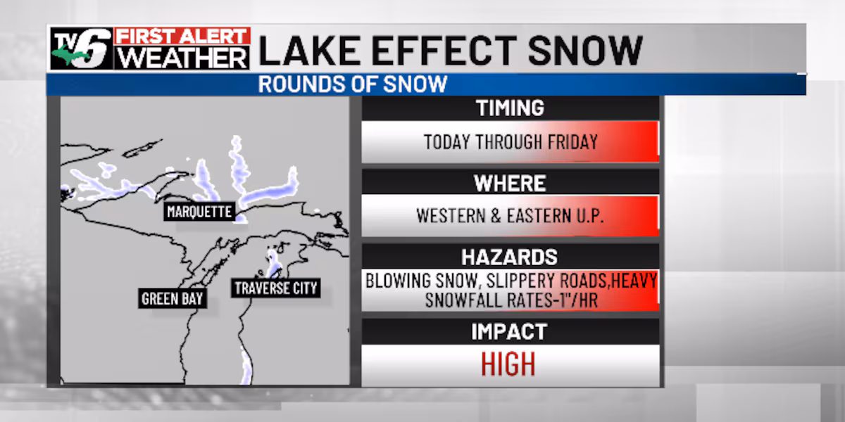 MARQUETTE, Mich. (WLUC) -Lake impact snow ramps up throughout the Western and Eastern U.P. Heavy snowfall charges of an inch per hour might happen within the jap counties. Travel by way of these areas may very well be hazardous at occasions with blowing snow and slippery roads.