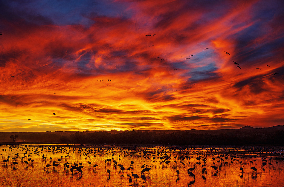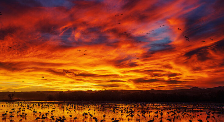 Bosque Del Apache is known for its sandhill cranes and snow geese.  Birds by the 1000’s migrate by means of the flooded ponds alongside the Rio Grande river.  But one yr the well-known ‘crane ponds’ have been drained, and no birds have been touchdown there.  Reports from Bosque mentioned don’t come this yr, there aren’t any birds, the crane ponds are dry…it’s a waste of time.  We had a workshop scheduled, so we arrived and located the crane ponds fully dry with no birds.  As we scouted the refuge, we discovered fish and sport had flooded a brand new space proper alongside the street, and even higher, cranes had packed the pond.  That evening we took our group there, and we had one of the vital superb sunsets I’ve seen.  The pond was loaded with cranes, extra birds have been flying in, and the sky and mirrored colours have been excessive.