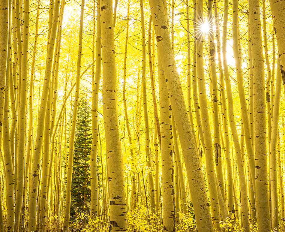 Last fall we went to Ouray, Colorado to {photograph} fall aspens.  We had heard the well-known reflection pond (crystal lake) had been drained, and that colours weren’t nice that yr.  We arrived to seek out that the lake was solely about half full, however nonetheless had respectable reflections.  But Red Mountain Pass had the very best shade I had ever seen after 20 years photographing the world.  And we discovered a magical aspen forest exterior of city to {photograph}.  A lone spruce tree was rising up by means of the thick aspens, all the things was bathed in a wonderful yellow glow.  Once once more a few of my favourite aspen pictures have been taken on a yr that we heard was a ‘bad’ yr in Ouray.