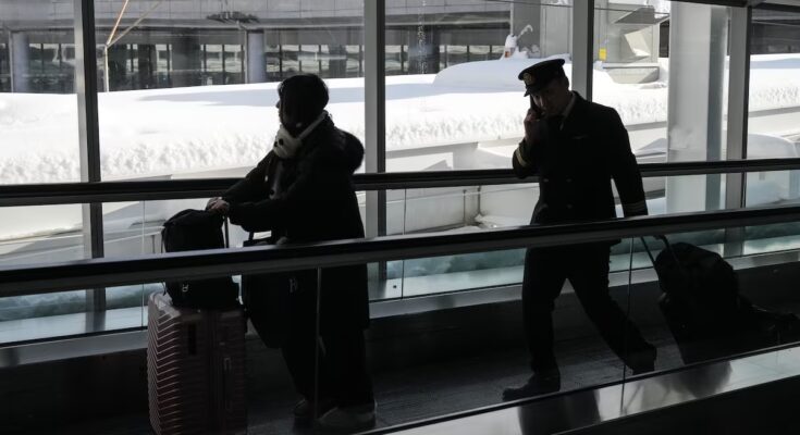 A passenger and a member of a flight crew stroll by means of Toronto’s Pearson Airport on Jan. 26.Chris Young/The Canadian Press