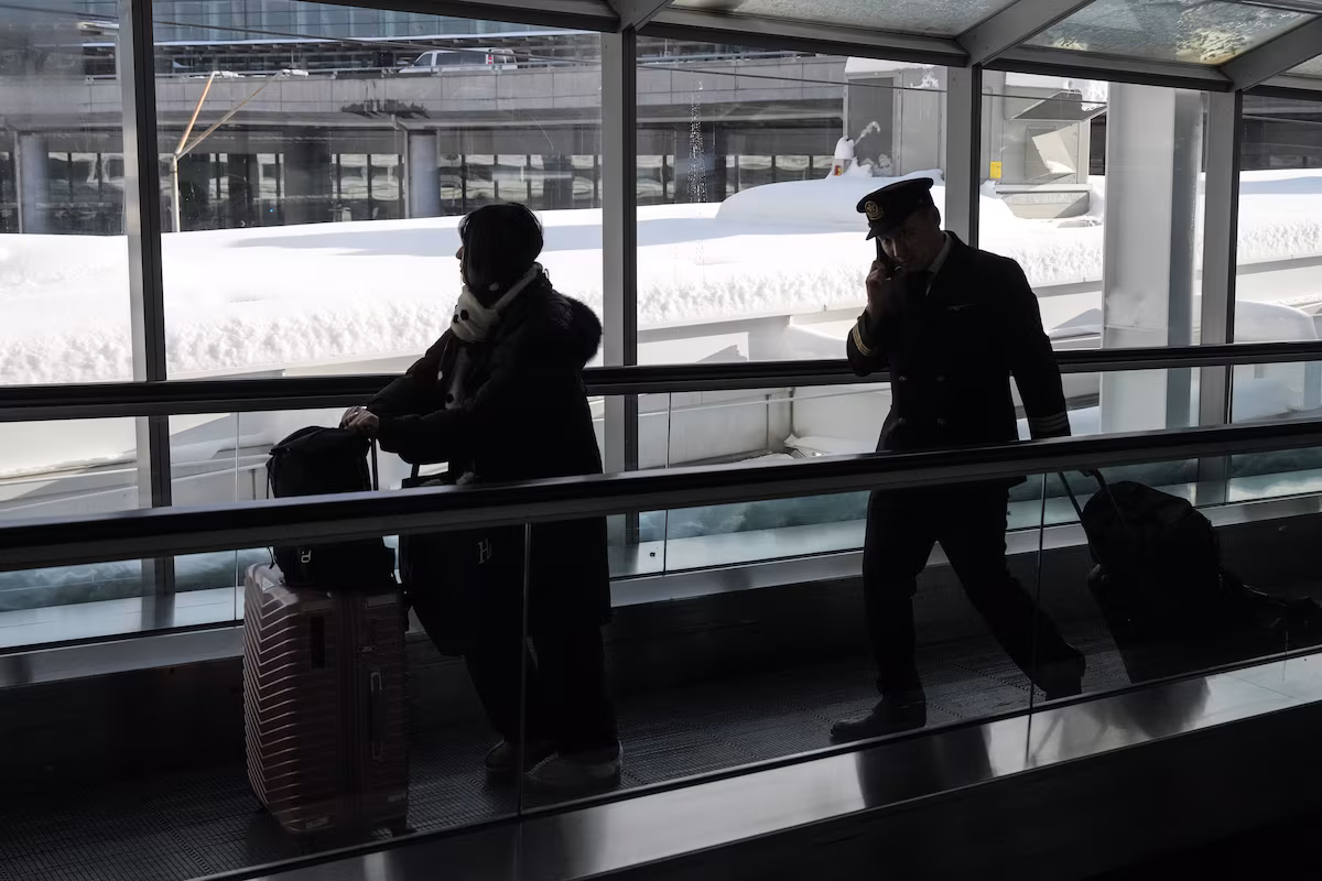 A passenger and a member of a flight crew stroll by means of Toronto’s Pearson Airport on Jan. 26.Chris Young/The Canadian Press