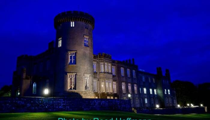 Dromoland Castle after sundown. We had an exquisite meal there for our remaining dinner of the journey.