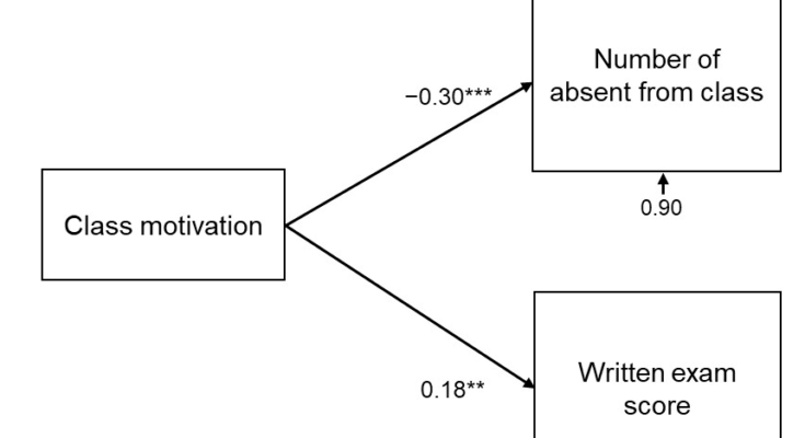 The bivariate correlation coefficient between the dependent variables, the absent depend from class and written examination scores, was −0.11 and never statistically vital (p = 0.09). In the primary mannequin, CFI = 1. 00 and RMSEA = 0.00. This yields a very good match to the info. Variables that weren’t vital (p > 0.05) have been excluded from subsequent fashions. In the ultimate mannequin (proven in Figure 1), CFI = 1. 00 and RMSEA = 0.00. This yields a very good match to the info. Table 3 lists the relative results of every variable on the dependent variable.