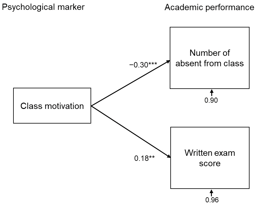The closing mannequin of path evaluation exploring key issue for educational efficiency. Class motivation was negatively related to the variety of class absences (β = −0.30) and positively related to written examination scores (β = 0.18). ** p < 0.01, *** p < 0.001.