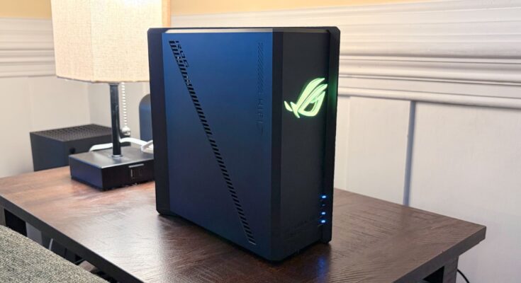 At first look, the ROG Strix GS-BE18000 doesn’t even look very like a router — the truth is, it seems extra like an Asus small type issue PC than a router. It has a tall, book-style design with no exterior antennas (the router’s eight antennas are all inside). The entrance face of the router has a big RGB-illuminated ROG brand and 4 standing LEDs within the lower-right nook (Wi-Fi, LAN, WAN, Power). You’ll additionally discover a beneficiant smattering of “Republic of Gamers” printed on the entrance of the router.