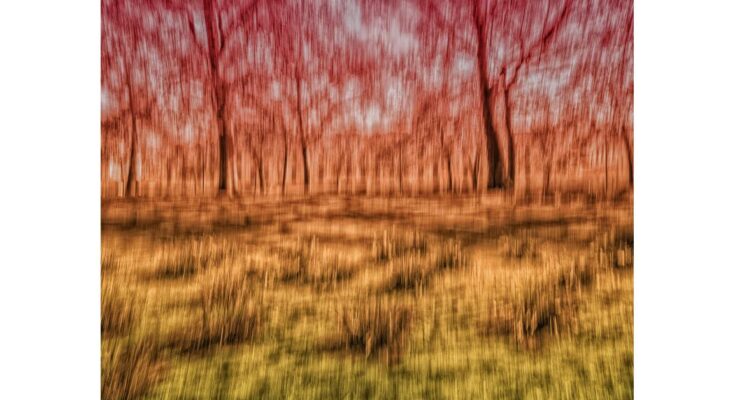 Abstract {photograph} created utilizing Intentional Camera Movement, the place heat reds, golds, and yellows merge right into a serene panorama in movement.