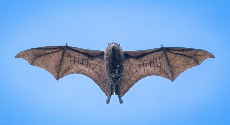 A flying bat is photographed from below against a clear sky, showing its outstretched, translucent wings and dark body.
