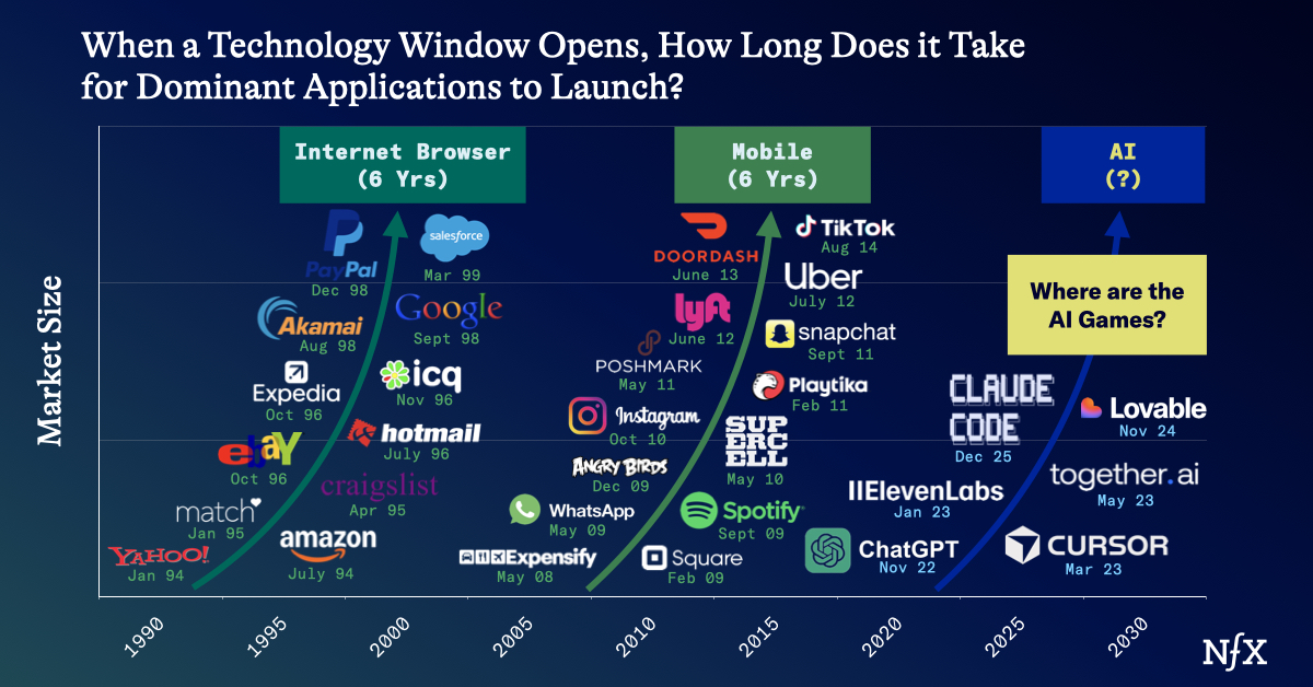 As you may see within the diagram above, the cellular know-how window was totally different. Angry Birds, Supercell and Playtika all launched inside 3 years of the cellular app retailer opening up. Why? Because the foundational applied sciences have been all in place instantly on these magical cellphones.