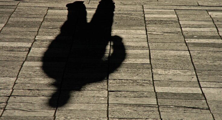 A clear shadow of a person standing on a stone-tiled pavement, with sunlight casting the silhouette sharply onto the ground.