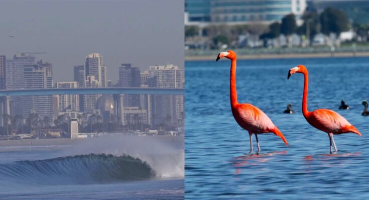 San Diego-based photographer Randy Dible captured photographs of two wild flamingos known as Pink Floyd and Pink Flo which can be well-known within the space. That identical day, he additionally took photographs of the surf breaking with the San Diego skyline and Coronado Bridge behind.