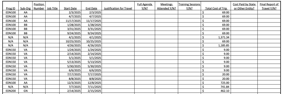DOE’s reporting challenges stem from the truth that completely different supervisors and superintendents are accountable for journey requests, Hallett mentioned, and journey agendas and receipts are submitted in prolonged paperwork, relatively than spreadsheets, which makes it onerous for the division to rapidly pull particulars for the Legislature.