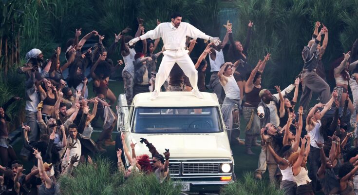 Bad Bunny opened in what seemed like sugarcane fields labored by dancers dressed within the straw hats of jíbaros (Puerto Rico’s rural farmers). Against this pastoral backdrop, Bad Bunny stood wanting trendy and fly, in a boxy white shirt patterned like an NFL jersey. He was rapping in Spanish to his smash “Tití Me Preguntó,” however the pigskin he held in his hand and the tie round his neck conveyed a transparent message to any viewer. He was right here for enterprise. He was right here to play ball.
