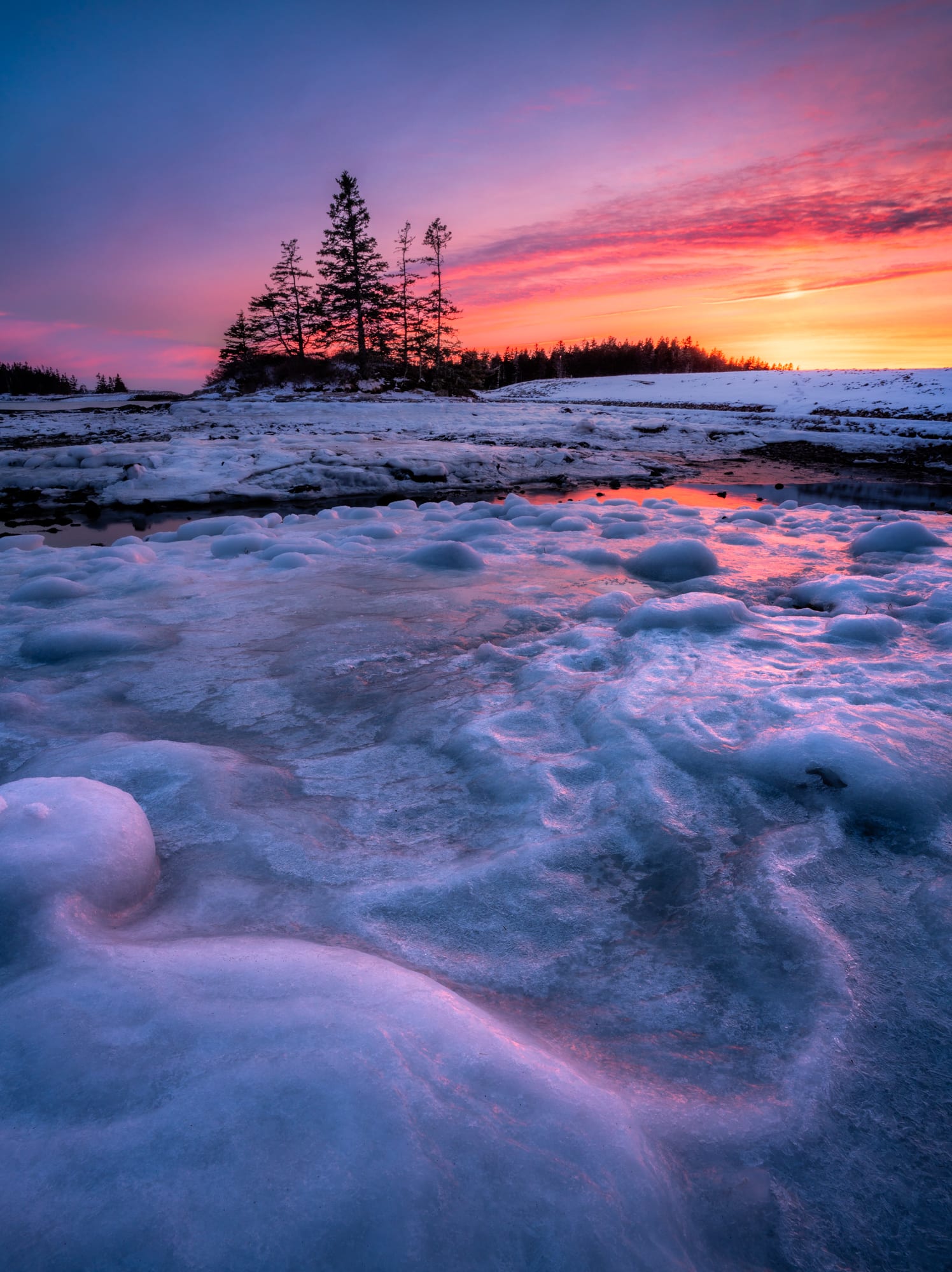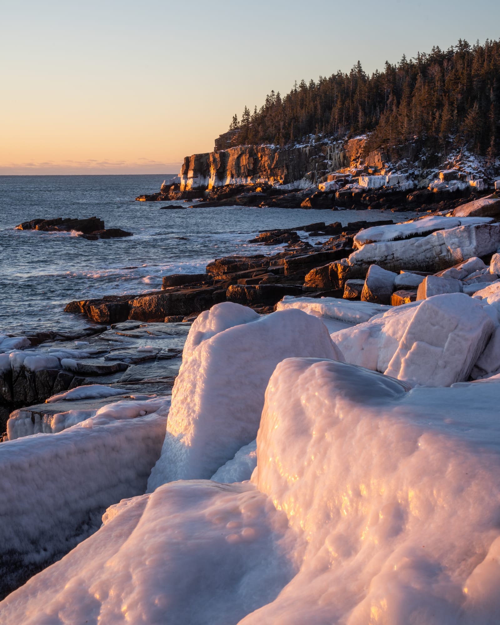 A much less cliché composition was discovered on a transparent morning taking a look at Otter Cliffs from a vantage level aside from Boulder Beach! This is a bit bit additional down the coast, the place the rocks are much more jumbled and chaotic. Thankfully a heavy coat of ice supplied a bit aid from the truth that this foreground lacked the robust shapes that I normally search for.