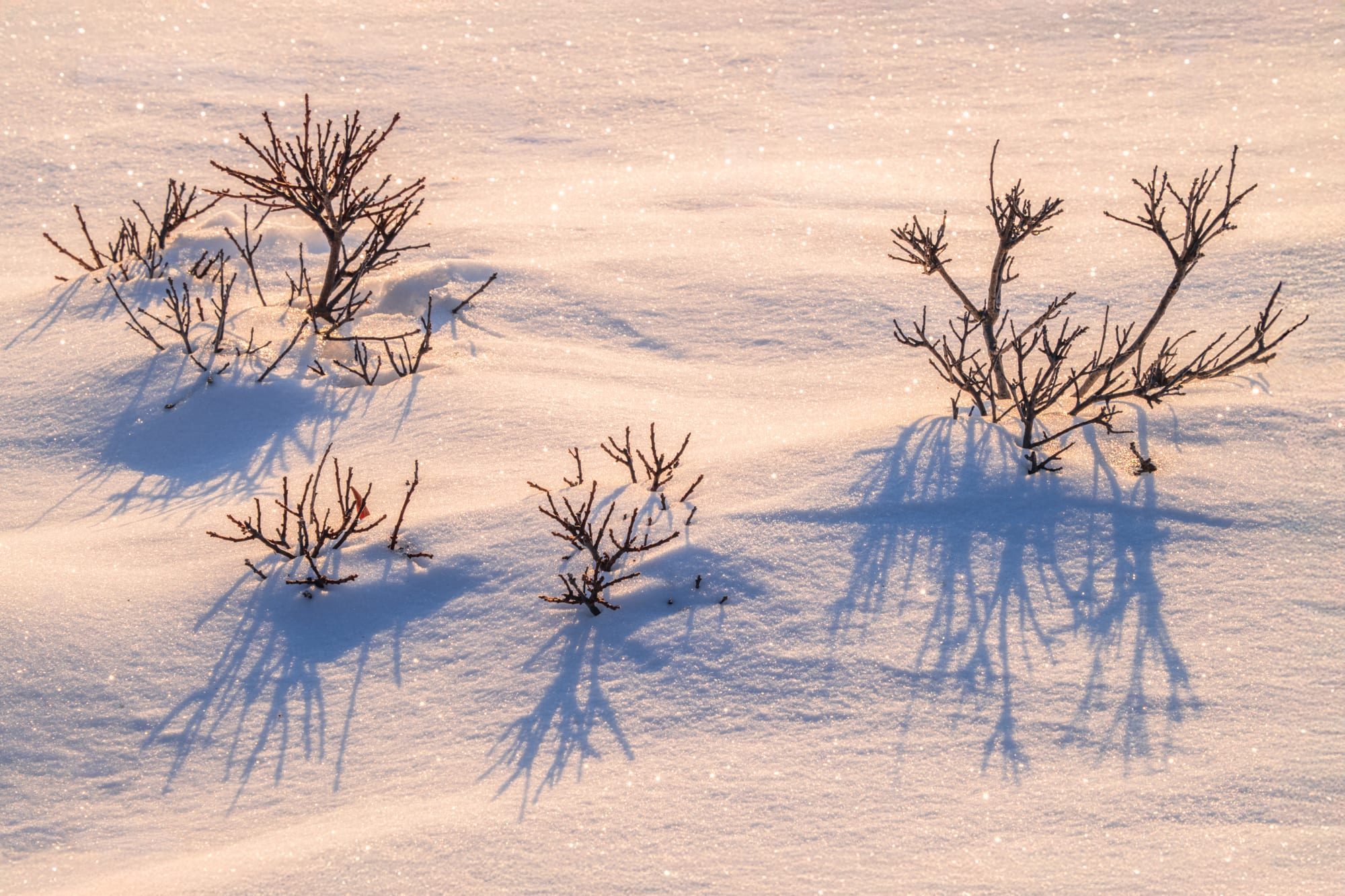 On one other morning, I spied these small shrubs peeking out of a snowdrift after the ‘best light’ had handed. I cherished the sparkles within the snow and shadows solid within the robust backlight.