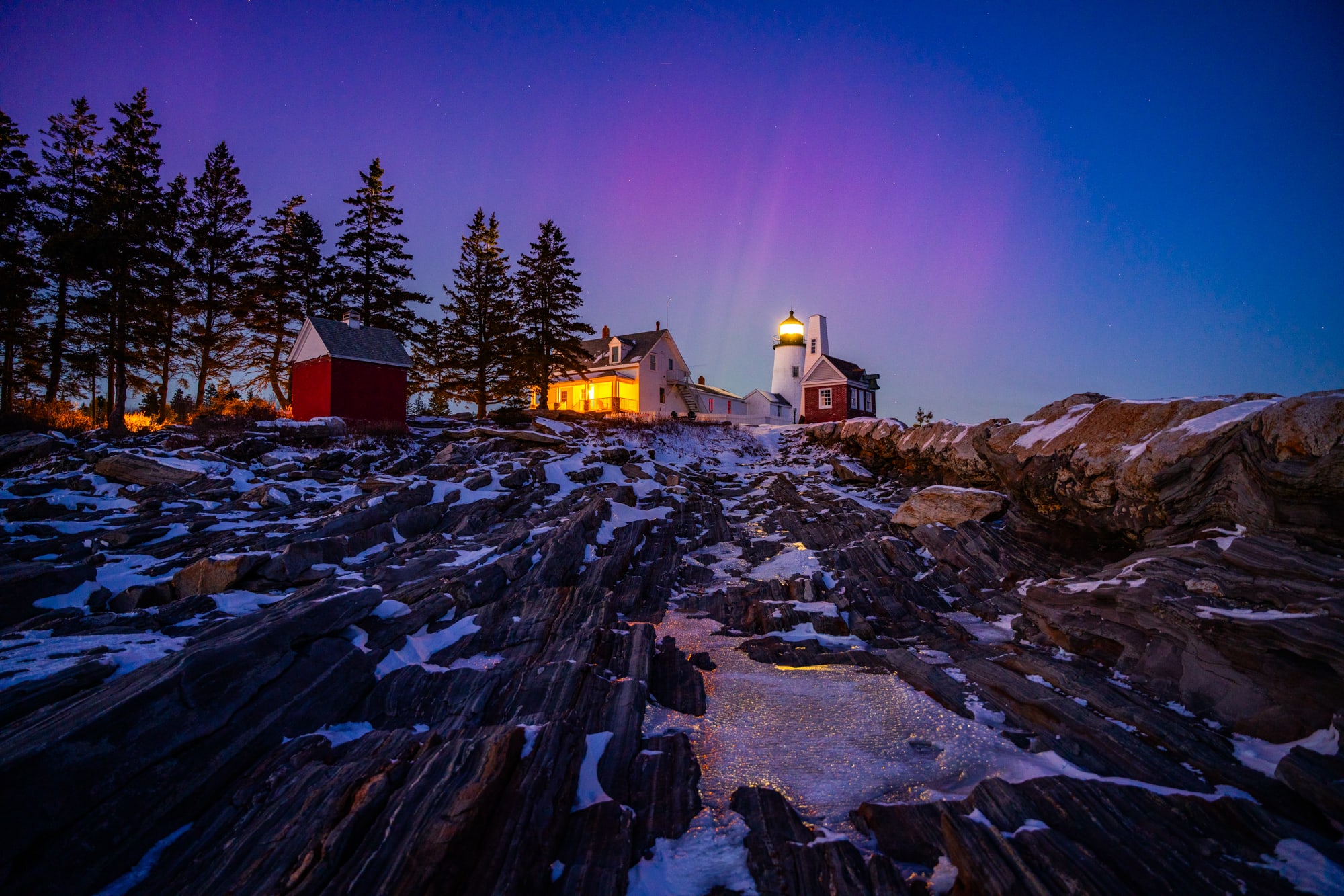Speaking of fine situations, the wind sculpted the snow into these wonderful ridges and supplied the proper foreground for this well-known view of the Bubbles from Jordan Pond. We had been all fairly chilly, however very completely happy, after standing out within the wind for this shoot.